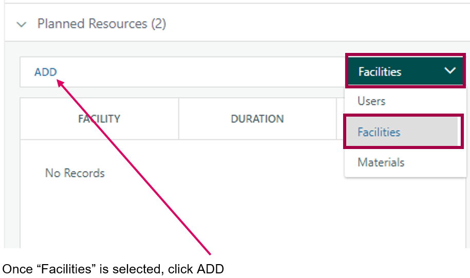 Select “Facilities” from the dropdown list in the Planned Resources pane: