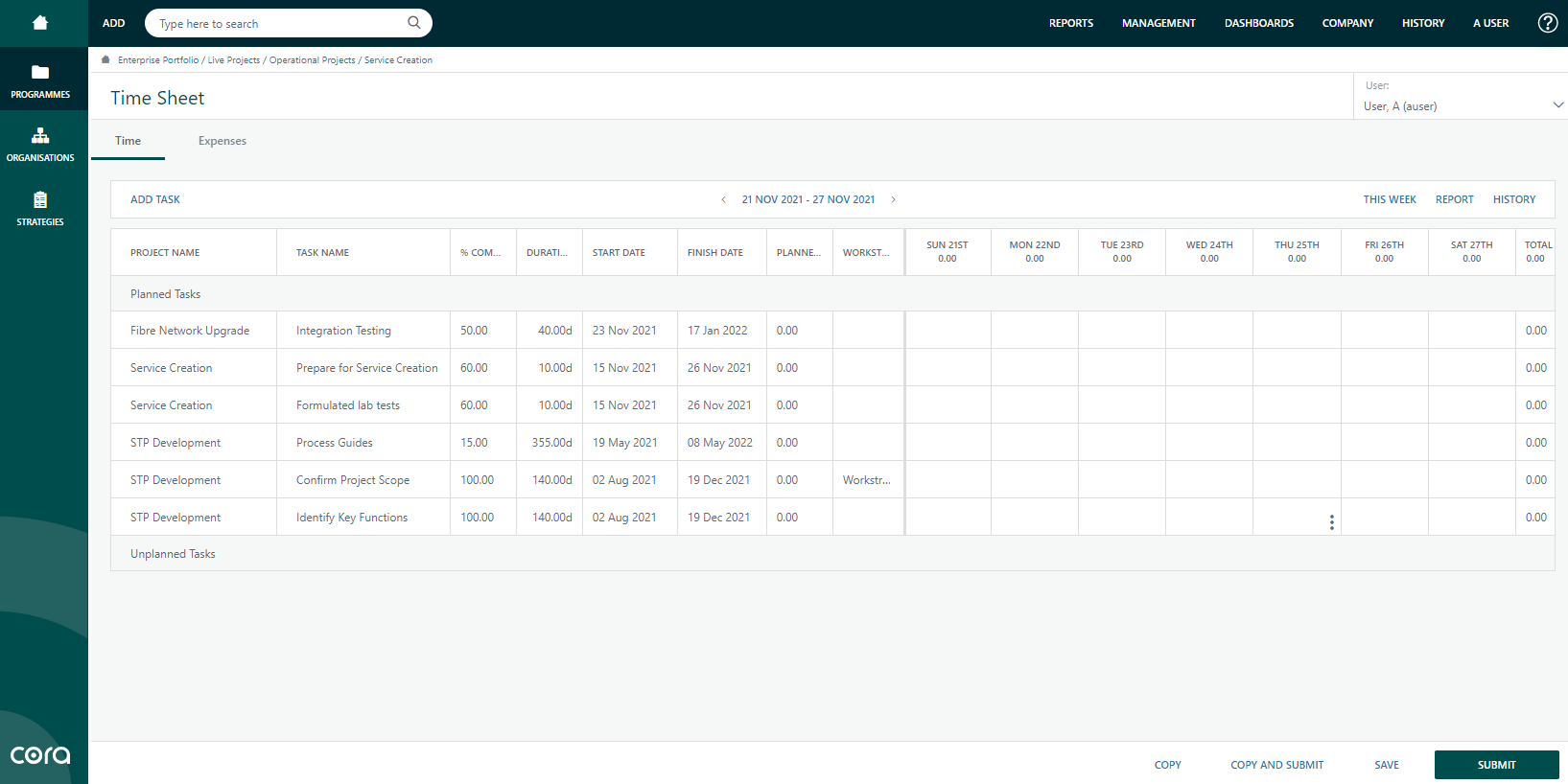 Cora has a built in Time Sheet which lets you log time against project tasks assigned to you.