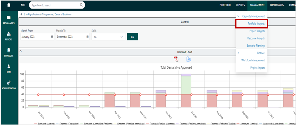 Click Portfolio Insights, under the Management menu within the Capacity Management down-down list, to access this dashboard.