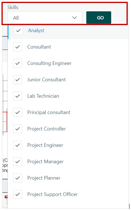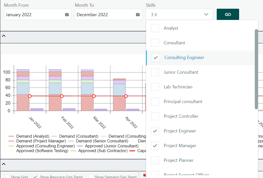 Also, you can toggle on and off the Resource information by clicking into the legend bar: e.g. If you click on “Demand Consulting Engineer” and “Approved Consulting Engineer” it hides the information in the graphic and “greys out” the skill in the legend.