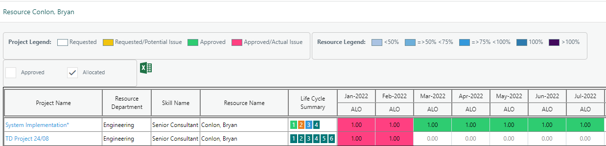 The Green Legend shows the approved allocation. The Pink Legend shows the “Approved/Actual” issue. In this case, Bryan Conlon has been over allocated and approved on two projects for Jan-2022 and Feb 2022.