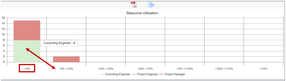 To view the resources that have less than 5% utilization for the skill “Consulting Engineer”, click into the utilization band: