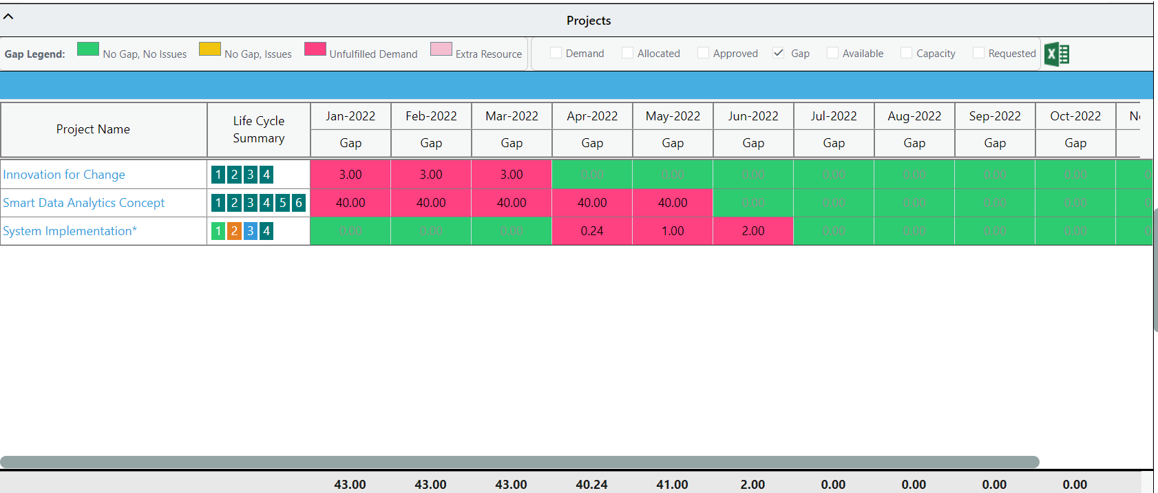 Your selection will show in the “Demand Chart”, “Projects”, “Resources” and “Approved Resources by Project” panels.
