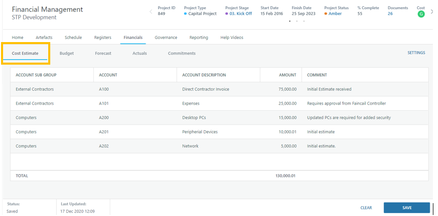 The Financial Management module of Cora PPM is used to manage all aspects of the Financial areas of a project, from initial estimate through to actual spend.