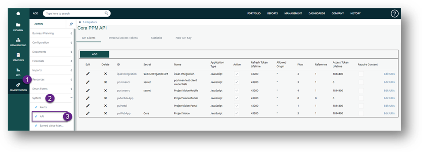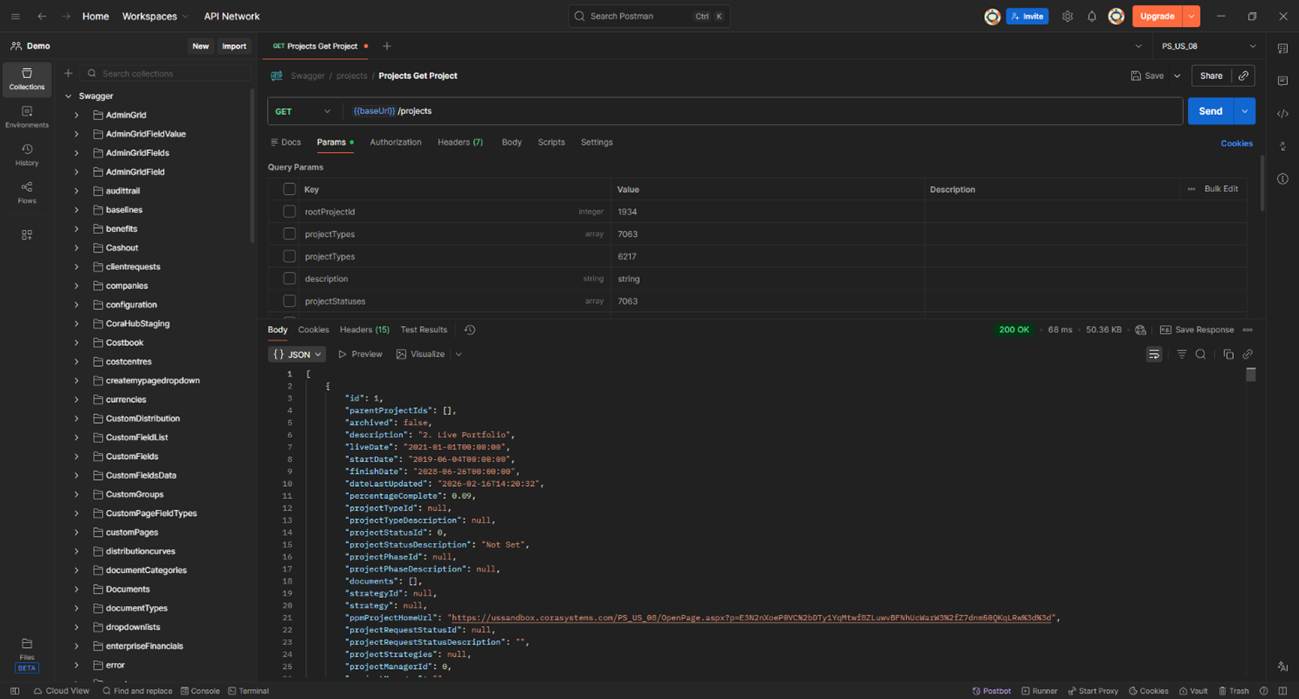 GET Projects | The most frequently used endpoint. Returns project IDs, names, descriptions, types, statuses, dates, and system-level attributes. Use the root ProjectID parameter to filter by program structure. |