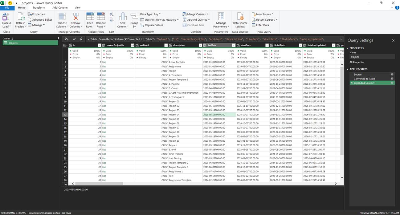 - Load and Transform: Click OK, then Connect. Power Query Editor opens, automatically converting JSON into a table. Expand nested fields, apply filters, and load into your report.