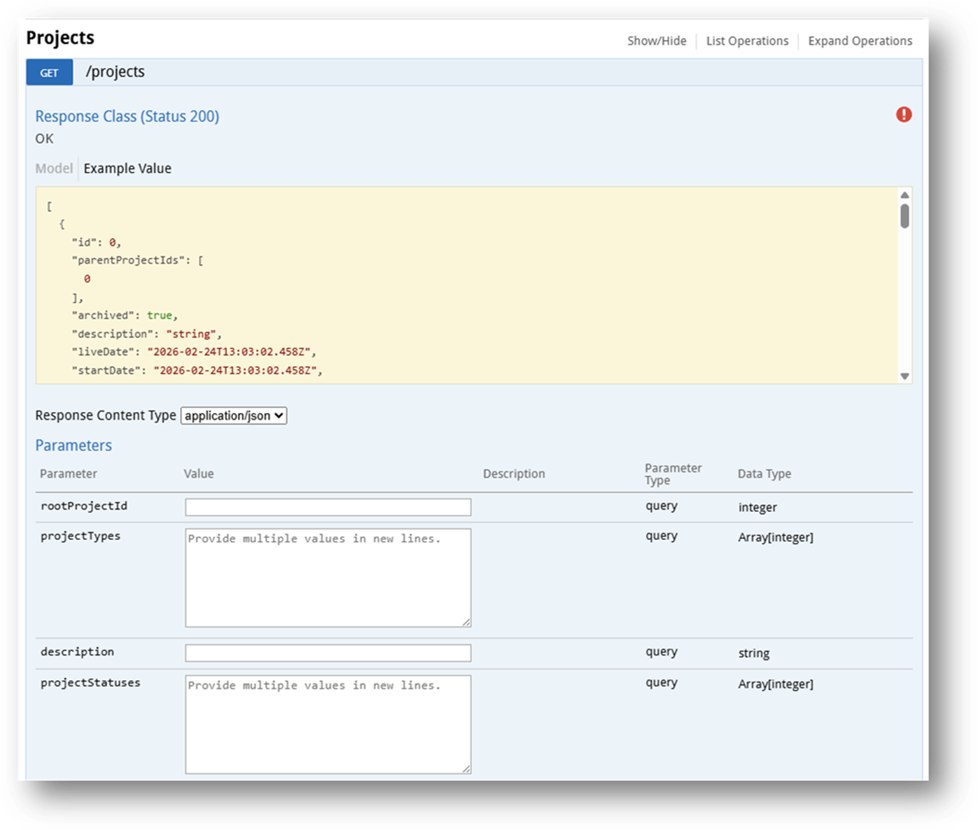 Once logged in, expand any endpoint (like GET Projects) and click "Try it out". Add optional filter parameters—like project type or root project ID—to narrow results. Click "Execute" and watch as Swagger displays the response in real-time.