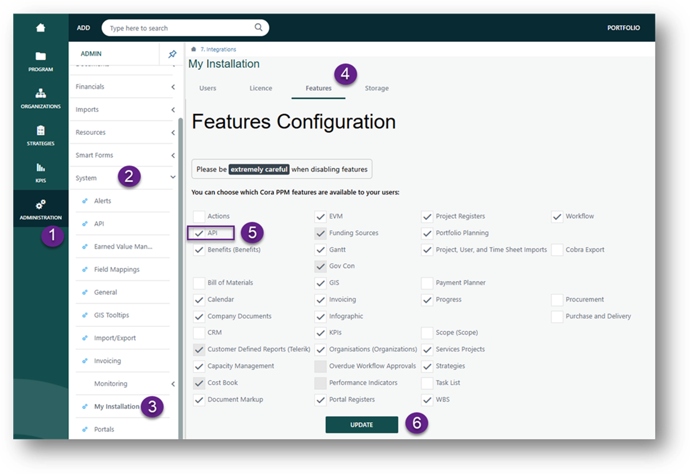 - Enable the API Feature: On the Features tab, check the box labelled "API" to activate API functionality. If the box is greyed out, you'll need to subscribe to the Cora Integration Platform through your sales team.