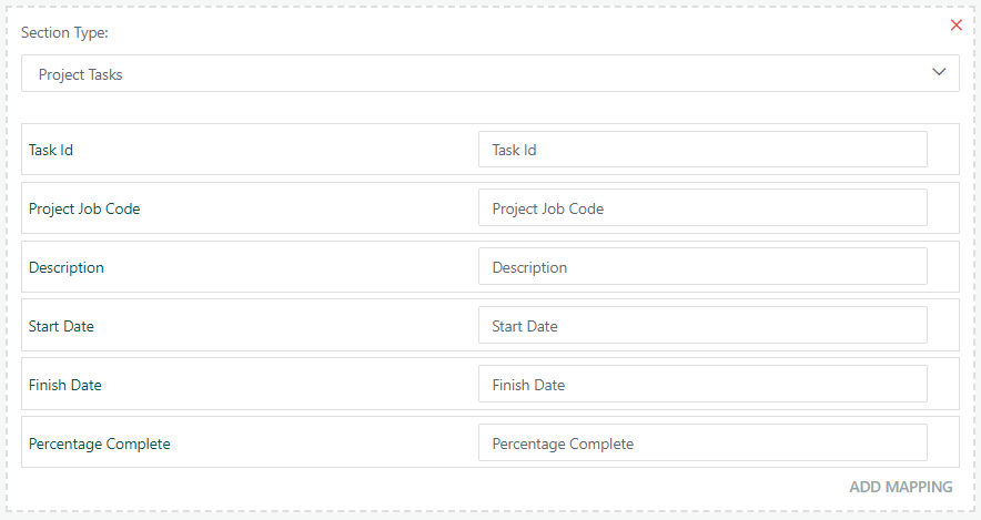 After a user has added the Sections, they will then in some case have to add additional fields. This is achieved by clicking on the ADD MAPPING at the bottom of the section.