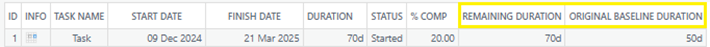 Users can now add the Original Baseline Duration to the Gantt. The value displayed is the Duration from the baseline marked as 'Is Current' for the Baseline type tagged as the baseline cost record under Admin | System | Project -> Baseline Codes tab. Screenshot below.