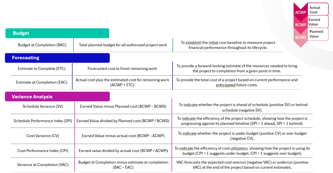 EV: The value of work actually completed at a specific point in time. In other words, EV measures the worth of work done to date in monetary terms.