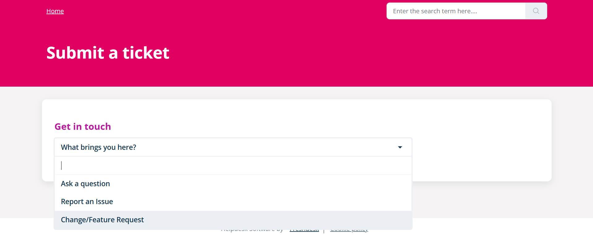 Select the relevant Ticket Type from the "What brings you here?" dropdown menu.